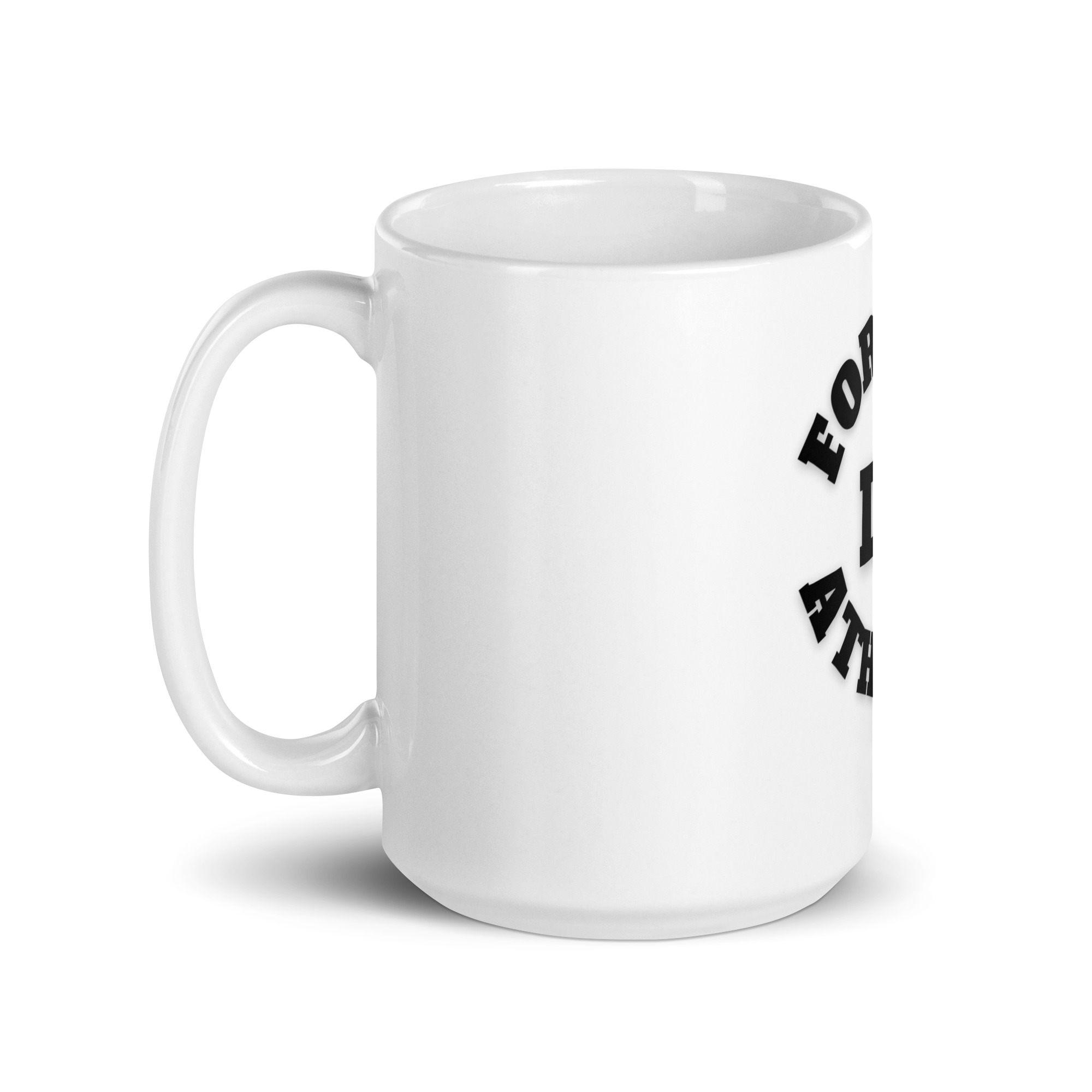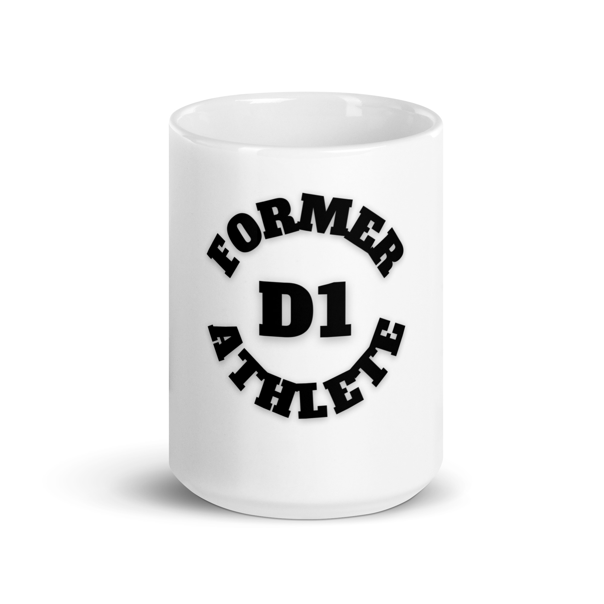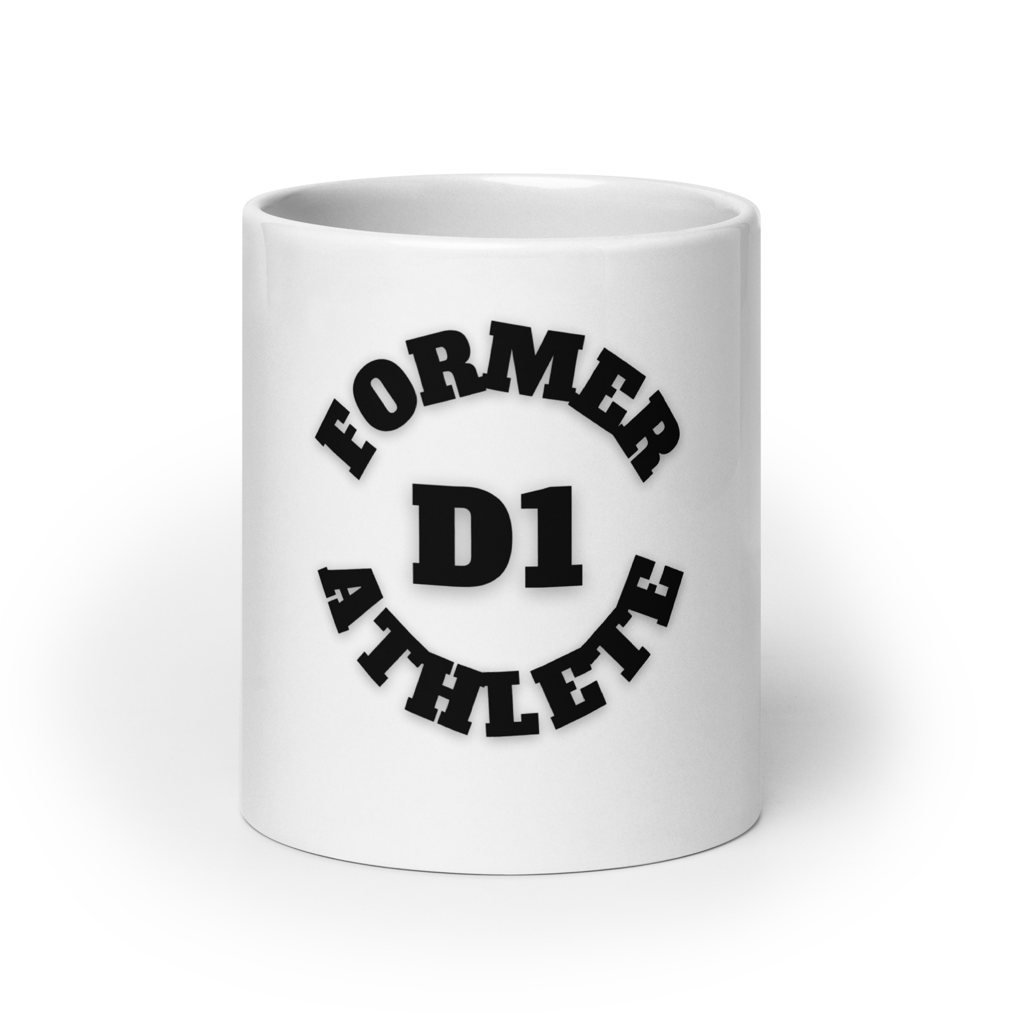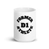 White glossy mug Former-D1-Athlete-(Alpha)-Circle-in-Black-Letters